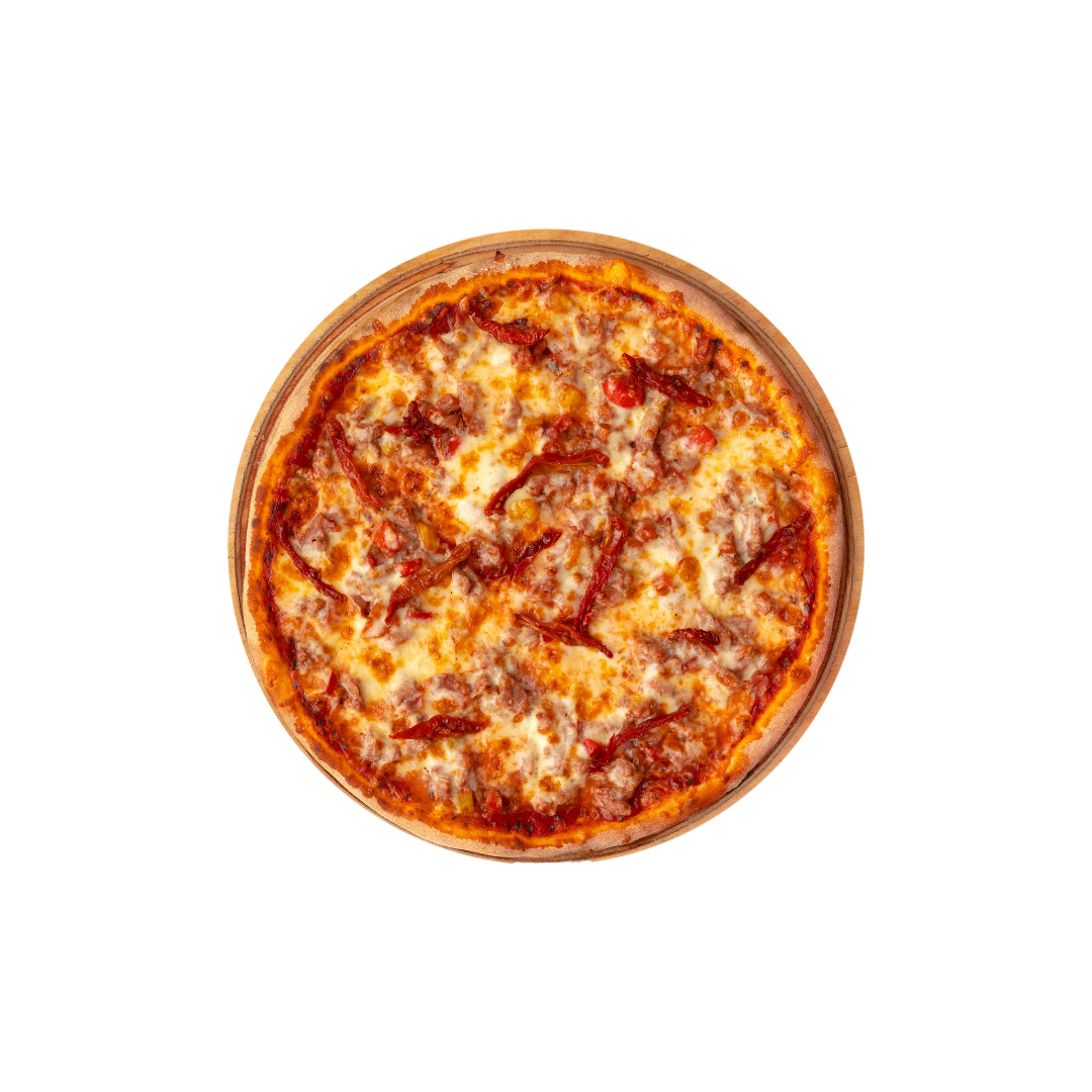 rajčinový základ, mozzarella, saláma, klobása, slanina, cibuľa -